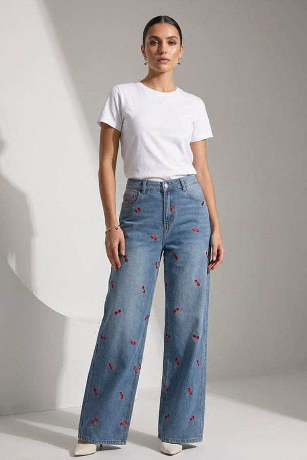 Τζιν Παντελόνι με Κεντημένα Κεράσια