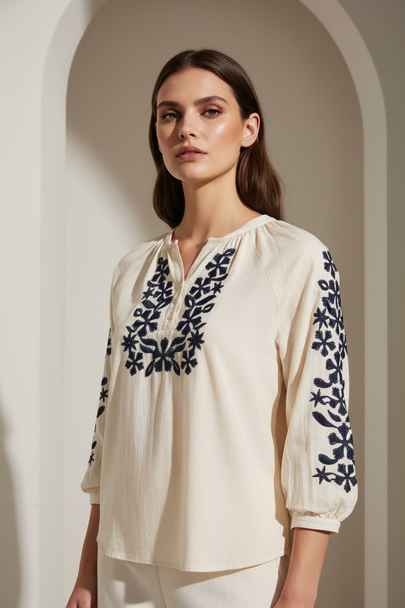 Σετ εκρού ζακέτα και παντελόνα με καφέ floral applique λεπτομέρειες Ellisargi Boutique