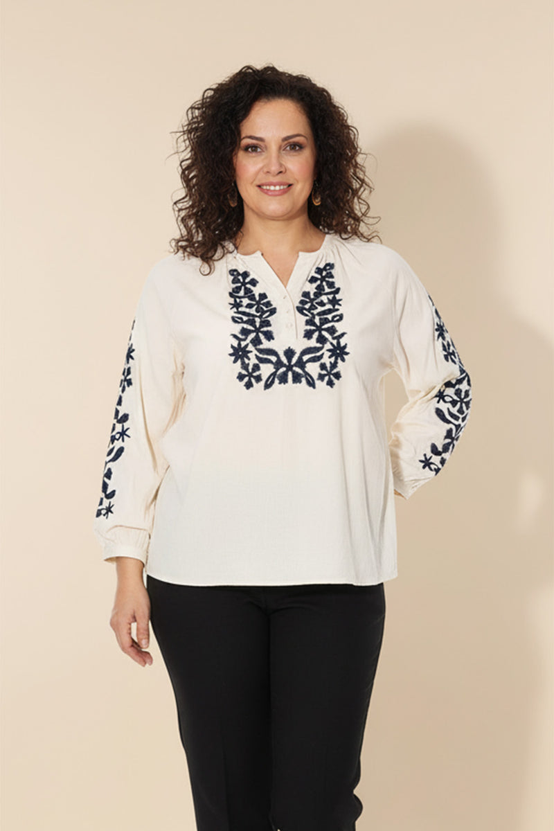 Εκρού μπλούζα με μπλε κέντημα